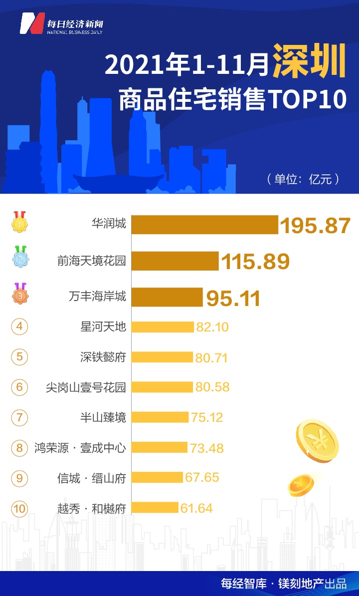 一线城市仍然保持了市场韧性,深圳1-11月TOP10楼盘累计销售额达到928.15亿元,成为重点城市中的累计销售冠军。