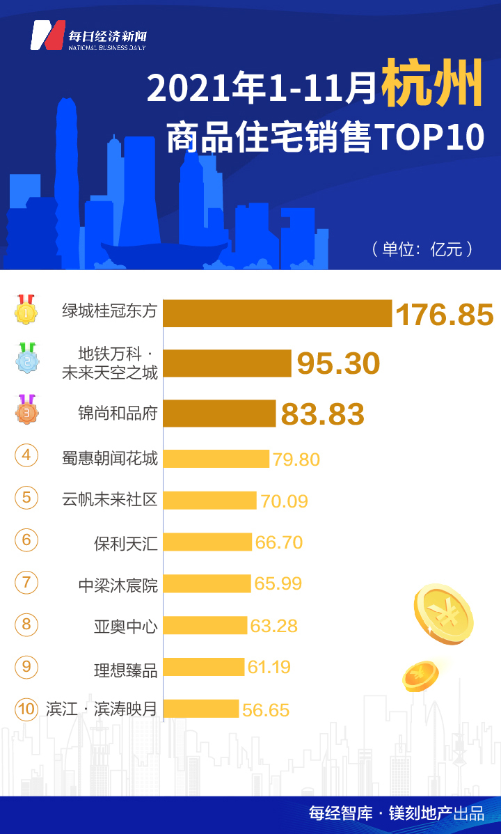 而单月销冠则被北京金隅凤栖家园以36.77亿元夺得;杭州锦尚和品府位列第二,单月卖出27.27亿元,占据杭州TOP10项目合计销售的72%份额。