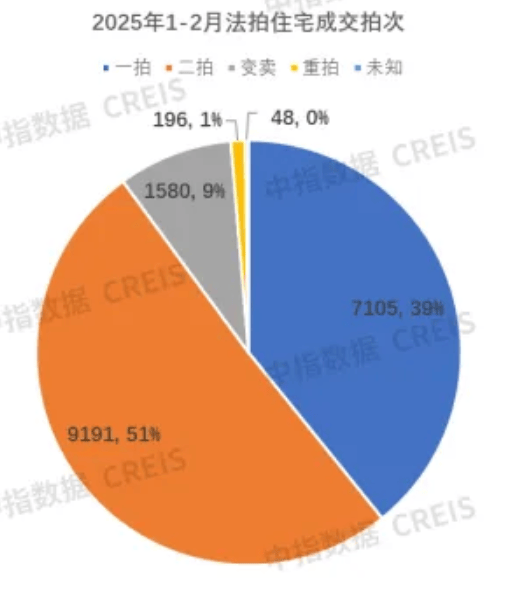细分来看,2025年1-2月,法拍住宅在各拍次中,一拍成交7105套,在各拍次中占比39.2%,较上一年增加约1.4个百分点;二拍成交9191套,在各拍次中占比50.7%,较2024年二拍成交占比减少0.7个百分点;变卖成交约1580套,占比8.7%;重新挂拍及其他情况成交约244套,占比1.3%。