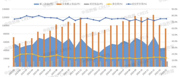 中指研究院数据显示,2025年1-2月,全国法拍房源交易截止累计拍次20.7万次,成交2.83万次;各类拍品成交折价率74.95%,与2024年同期相比,成交折价率减少约14.6个百分点;各类拍品成交平均拍1.92次,平均成交时长约73天。