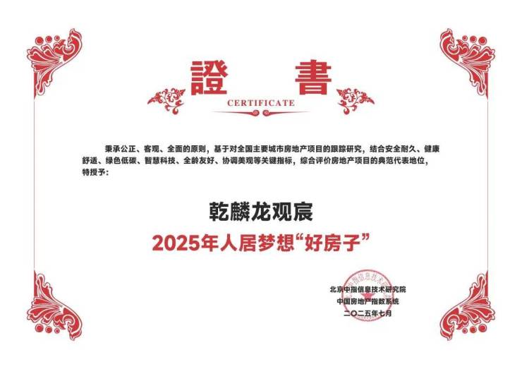 中指研究院长期以来一直从健康宜居、全龄友好、绿色低碳、科技智能、安全耐久、协调美观等六大维度深入研究“好房子”,为进一步促进房地产行业高质量发展,满足人民群众对优质住房的新期待,通过课题组初选、网络票选、专家评审相结合的方式,优选并发布『2025年人居梦想“好房子”』。在全国170余个入围项目中,亁麟龙观宸脱颖而出,荣获‘2025年人居梦想“好房子”’殊荣。