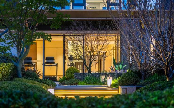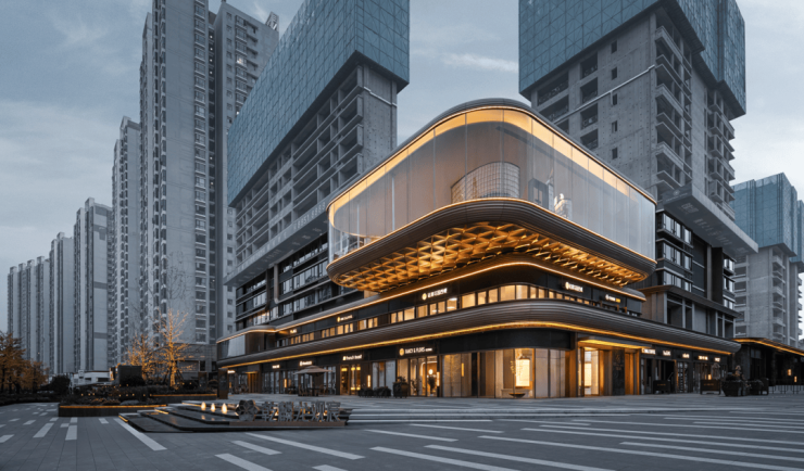 临街商业层面,乾麟龙观宸借鉴上海新天地的开放式商业布局,以“赖特花园”为蓝本,融合海派建筑中的流线型美学与贵阳喀斯特地貌的层叠意象,通过多层次立体绿化、悬浮钢结构与石材幕墙的复合工艺,打造奢享海派⻛情的商业,运用盒⼦状体镶嵌在花园街区中,三层悬浮挑空转角商业犹如夜光宝盒⼀样闪烁在夜空之中,呈现出无可比拟的高级艺术感。