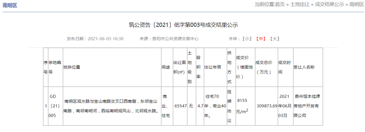 6月份,佳源国际旗下的贵州恒丰佳源房地产开发有限公司,以30.98亿元成功拿下该地块,成交楼面价为8155元/平方米。
