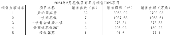 商品房销售榜单上,2月份花溪区卖得最好的项目是美的国宾府,往后是中铁阅花溪、中铁青岩健康小镇、贵高速花溪26°,以及清溪馨苑。