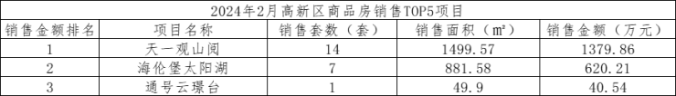 商品房销售榜单里,高新区因容量问题并不能凑齐TOP5,因此只有天一观山阅、海伦堡太阳湖和通号云璟台在榜。