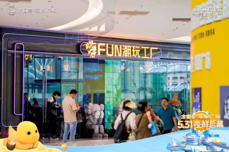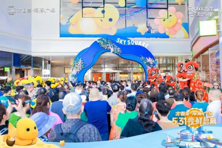 当人们走进方圆荟·海豚广场 ,便能看到海底星空长廊、波浪中庭、流量IP美陈奶龙沙滩派对、高达12米的跨层扶梯、天空之船、心跳灯塔等充满海洋美学元素的场景。 整个项目充满了休闲、娱乐、社交与游逛打卡属性。