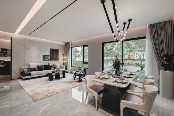约7米客餐厅相连的朗阔空间,尽显气派。能充分满足家庭休闲和日常社交,无论是与家人共度美好时光还是与好友推杯换盏谈天论地,都能让彼此的身心得到舒展,将生活的意趣与亲友的欢乐妥善安放,让起居待客,皆享宽敞空间的自在舒适。
