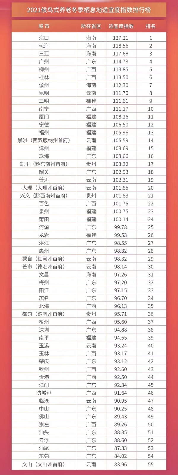 这些排在前30位的城市在冬季候鸟式养老城市中均显示出较强的综合竞争力。