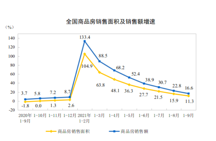 从销售层面来看,国家统计局数据显示,1-9月份,全国商品房销售面积约13.03亿平方米,同比增长11.3%;商品房销售额约13.48万亿元,同比增长16.6%。
