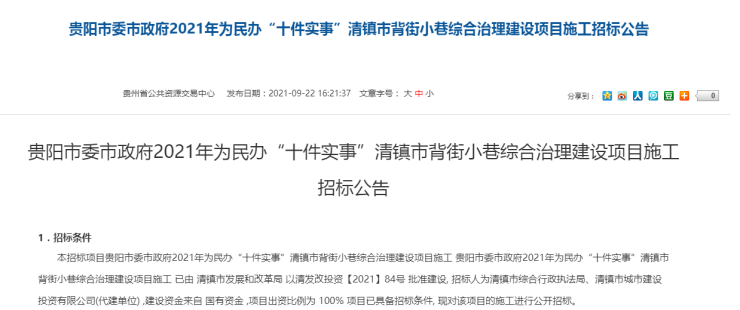 9月22日,据贵州省公共资源交易中心公示,贵阳清镇市发布了关于背街小巷综合治理建设项目的施工招标公告。