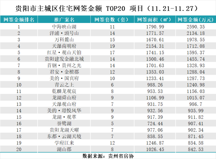 据贵州省房协统计数据,2025年11月21日至2025年11月27日,贵阳主城六区住宅网签金额榜单中: