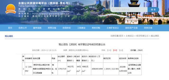 资料显示,金茂西南企业管理(重庆)有限公司,于2019年12月30日,以20.83亿元的成交价,竞得观山湖区G(19)092号商住地块。