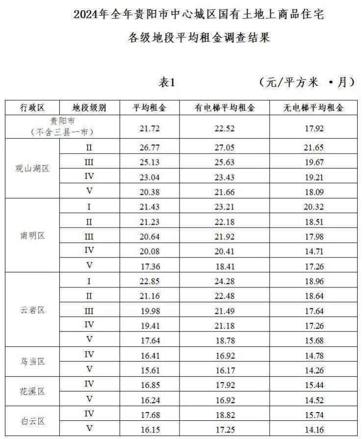 4月28日,贵阳市住房和城乡建设局公示了2024年贵阳市中心城区国有土地上商品住宅各级地段平均租金调查结果。