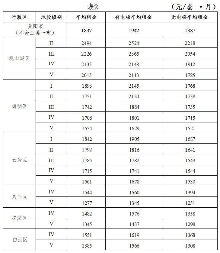 其中租金最高的地段,为观山湖区Ⅱ级地段,平均租金为26.77平方米·月、2494元/套·月;