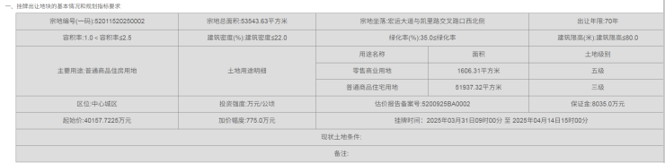 据悉,52011520250002号地块位于贵阳市观山湖区宏运大道与凯里路交叉口西北侧,规划用途为居住用地,兼容商业建筑。