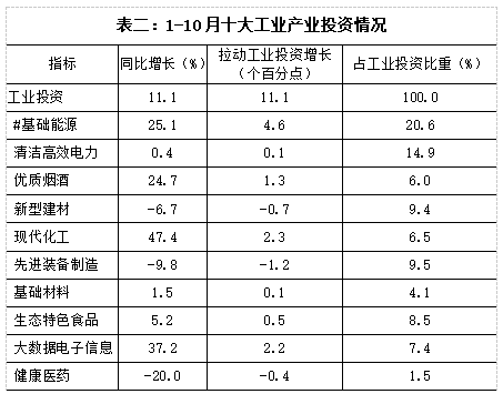 十大工业产业投资增速“7正3负”。1-10月,全省十大工业产业投资中,7个产业投资比上年同期实现正增长,增长较快的有:现代化工投资增长47.4%,大数据电子信息投资增长37.2%,基础能源投资增长25.1%。3个产业投资较上年同期负增长,分别为健康医药投资增长-20%,先进装备制造业投资增长-9.8%,新型建材投资增长-6.7%。