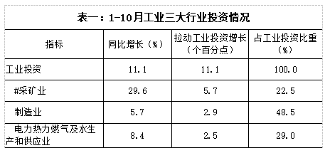 工业三大行业投资均实现不同程度正增长。1-10月,采矿业投资比上年同期增长29.6%,拉动工业投资增长5.7个百分点;制造业投资比上年同期增长5.7%,拉动工业投资增长2.9个百分点;电力热力燃气及水生产和供应业投资比上年同期增长8.4%,拉动工业投资增长2.5个百分点。