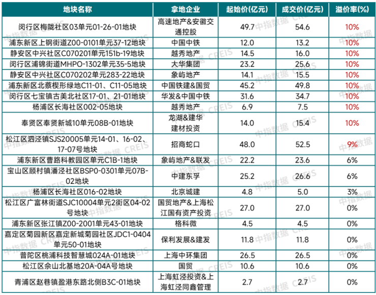 不难看出,即便是土地市场表现最好的上海,销售端的走弱仍然影响房企拿地的活跃度,一些非核心地块底价成交成为常态。此外,热门板块和核心优质地块依旧保持较高的热度,房企抢地积极性较高,极易触顶成交。相较而言,部分位置不佳或位于远郊的地块多以底价成交,有些地块甚至需要地方国企托底。