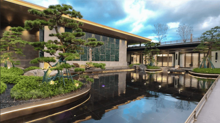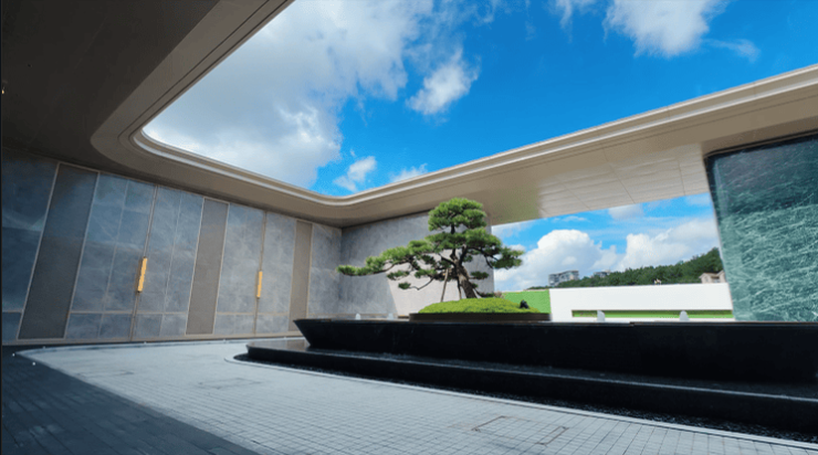 值得一提的是,本次观山及第还打造了约2000㎡的东方意境会所。其 30 米宽的巍峨门庭遵循酒店式入户规制,汲取宋式极简美学精髓,以松石为骨、瓦灰为韵,再用金线勾勒点缀,开合之间尽显尊崇气质。门庭正中,更有一棵特选的百年黑松傲然挺立,彰显出高贵风雅的气度。