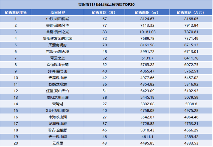 虽然在11月贵阳主城商品房TOP20榜单中并没有出现销售额破亿的项目,但整体4000多万的榜单门槛还是守住了。
