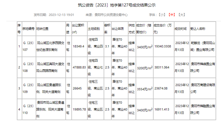 本次该地块成交楼面价为3200元/平方米,总成交价38311.064万元,竞得人为贵阳市锦峰置业有限公司,其上级企业为贵阳市投资控股集团房地产置业有限公司和贵阳观山湖新型城镇化建设投资有限公司。