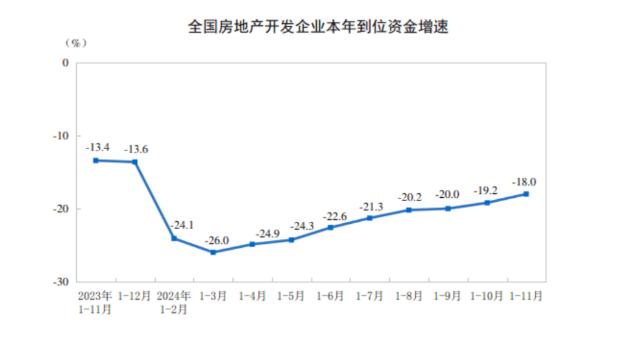 1—11月份,房地产开发企业到位资金96575亿元,同比下降18.0%。其中,国内贷款13476亿元,下降6.2%;利用外资30亿元,下降29.2%;自筹资金34676亿元,下降11.0%;定金及预收款29624亿元,下降25.2%;个人按揭贷款13911亿元,下降30.4%。