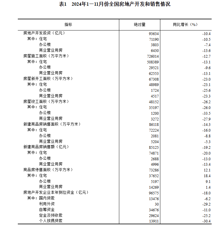12月16日讯,国家统计局发布数据显示,1—11月份,全国房地产开发投资93634亿元,同比下降10.4%;其中,住宅投资71190亿元,下降10.5%。