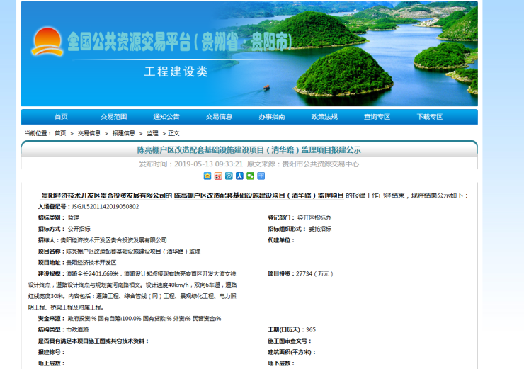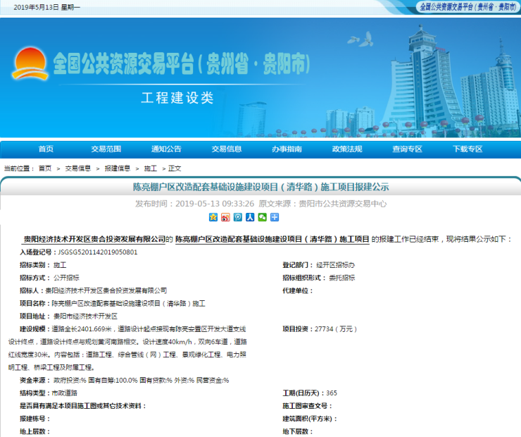 贵阳市经开区陈亮棚户区改造配套基础设施建设项目(清华路)监理、施工项目的报建均已完成!