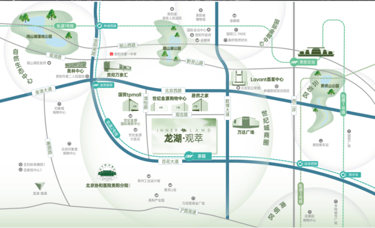 与此同时,城市重要交通路网也在这里交汇,两纵(金阳南路、数博大道)两横(百花大道、北京西路)一轨(2号线),可任意通达贵阳全城。未来,从观萃家里出发,直线距离约300米,便能走进2号线茶园站,坐上通往贵阳全域的地铁;也可以轻松步入金源购物中心,享受商圈繁华。