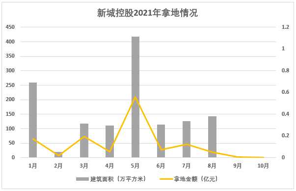 表现在数据上,新城控股上半年共计新增土地储备61幅,总建筑面积达1831.61万平方米。下半年开始,该公司的拿地有所减少,前10月该公司共计拿地96宗,新增土地面积591.52万平方米,新增土地计容建面1316.97万平方米。