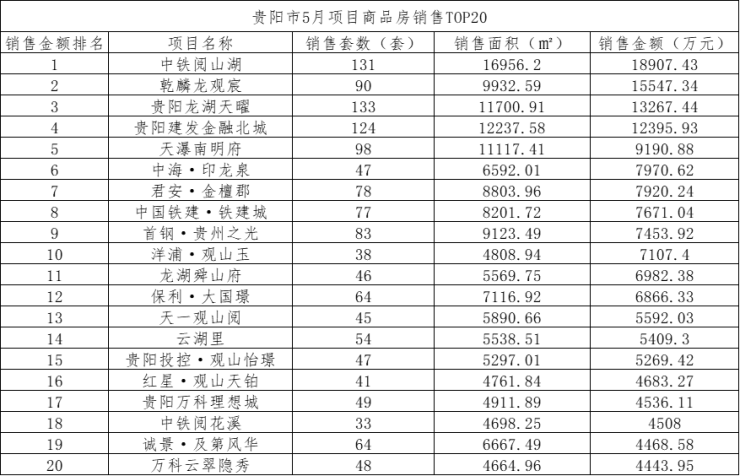 5月份的商品房TOP20榜单,依然是观山湖区一家独大,20个项目独占11个名额。