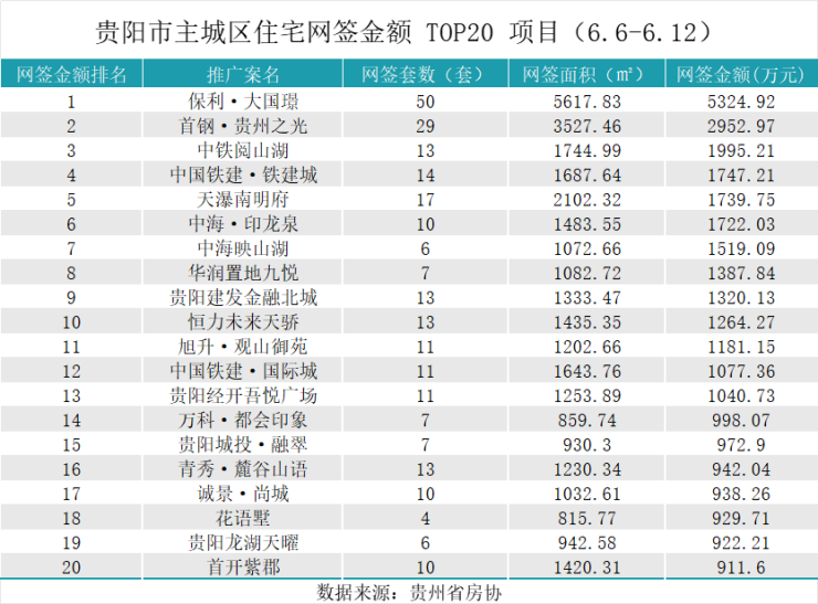 据贵州省房协统计数据,2025年6月6日至2025年6月12日,贵阳主城六区住宅网签金额榜单中: