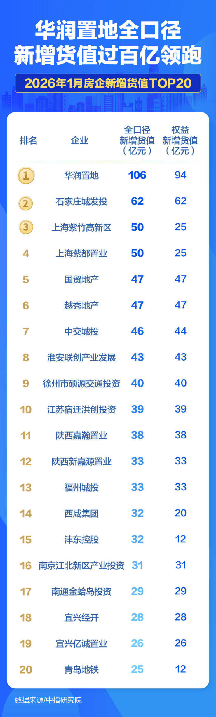 从全口径新增货值来看,1月份,华润置地以106亿元位列第一,石家庄城发投以62亿元紧随其后,上海紫竹高新区以50亿元位列第三。具体来看,华润置地联合青岛地铁集团以10亿元竞得青岛市市南区中片区SN0501-23地块;上海紫竹高新区则联合上海紫都置业,以8亿元拿下上海市闵行区MHP0-1005单元14-09地块。
