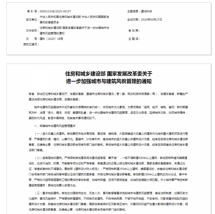 通知中,对新建500米以上、250米以上及100米以上建筑进行规范。并且在超高层地标建筑方面,要严格限制各地盲目规划建设超高层“摩天楼”,一般不得新建500米以上建筑,严格限制新建250米以上建筑。
