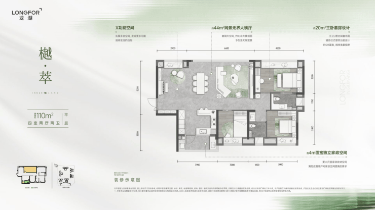 110㎡平层:约44㎡的阔景横厅、10米观景阳台,可变拓展空间和4米面宽独立家政间,功能配置全面升级,改善品质一目了然。