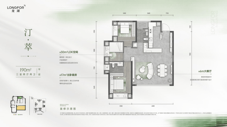 90㎡平层:采用三房两卫格局,6米横厅搭配约30米LDK一体化空间和生活阳台,以“小面积大尺度”打破常规,兼具实用性和成长性。