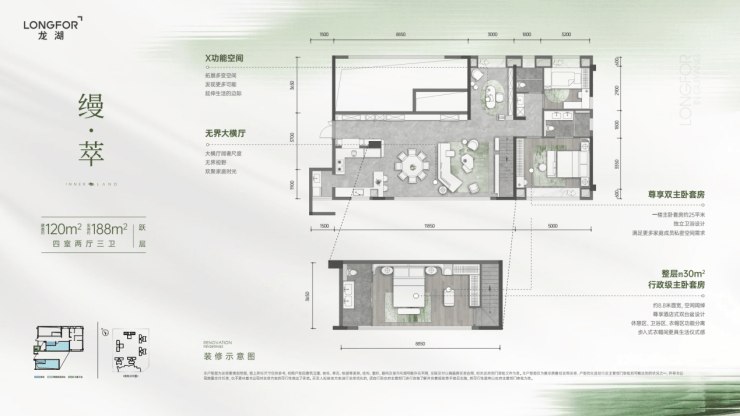 120㎡跃层:实得面积约188㎡,双主卧套房搭配阔尺横厅,直接满足进阶改善的需求。