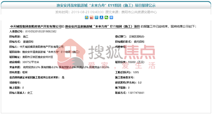 【搜狐焦点讯】8月23日,据贵阳市公共资源交易中心较新消息,云岩区渔安安井温泉旅游城“未来方舟”E11组团(施工)项目报建工作已经完成。该项目用地面积308752平方米,预计投入5.5亿元!