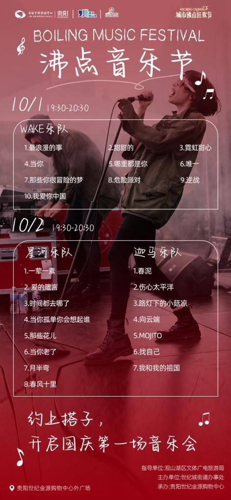 越夜越摇滚,10月1-2日由观山湖区世纪城街道办主办,贵阳世纪金源购物中心协办的首场街边沸点音乐会掀起区域新潮音浪,超人气乐队WAKE乐队摇滚空降,还有神秘嘉宾惊喜开唱,假期第一场0门槛音乐会不可错过!