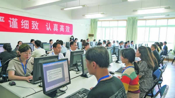据介绍,今年的评卷工作依然采用先进的技术手段,以机上阅卷方式进行,在全省选调了2291位政治素质高、业务能力强、极具责任心的教师和工作人员参与评卷工作。试卷首先进行扫描和切割,每道试题由系统随机分派两位评卷教师进行独立评阅,如果评分结果误差超过阈值范围,则由系统再随机分派给第三位评卷教师进行评阅,如果评分结果与前两位评分教师还存在超过阈值的误差,则送交专家组进行裁定,确保将评分误差降至较低。