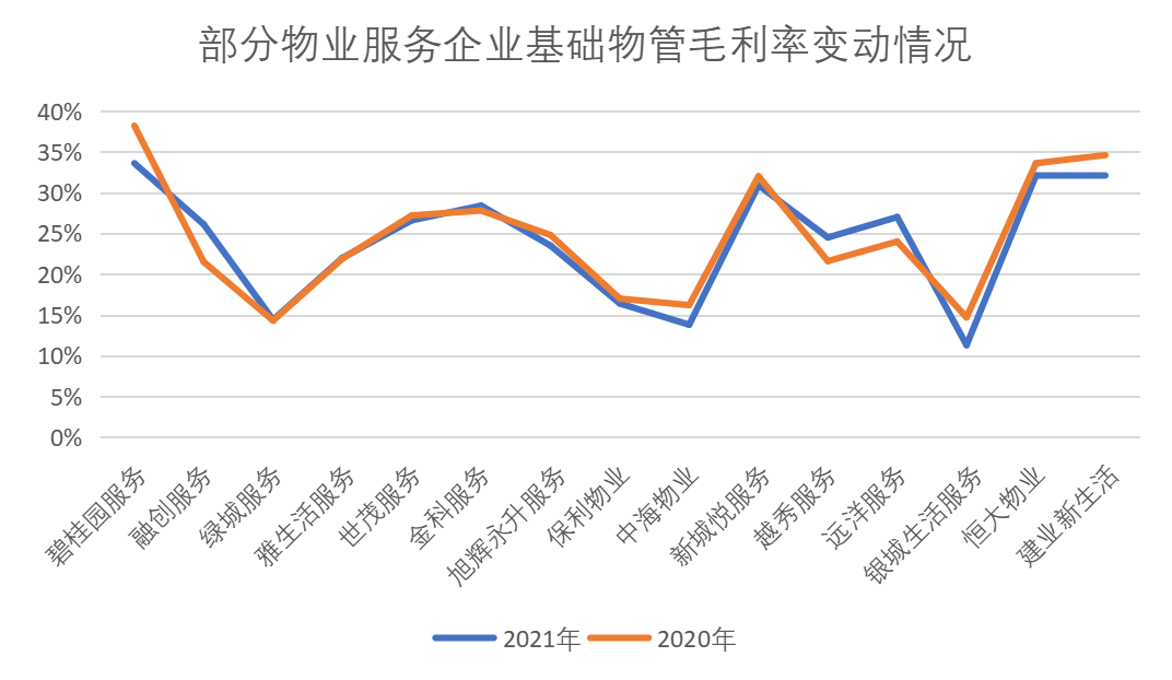 在基础物管服务毛利率普遍下降的背景下,15家样本企业的整体毛利率由2020年上半年的28.81%调整至2021年上半年的28.47%,与去年基本持平,可以认为企业通过调整业务结构产生了一定积极的影响,基本缓冲了由于基础物管毛利率下滑带来的影响。