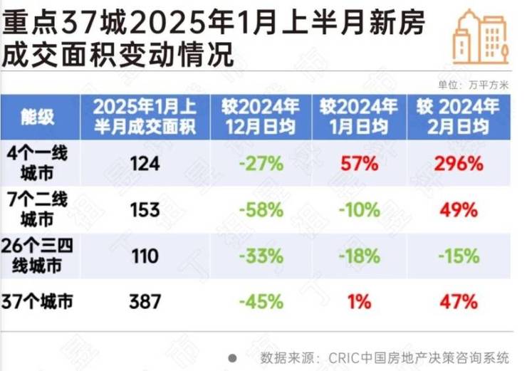 同时,克而瑞研究中心数据,2025年1月上半月,重点23城总成交规模达到了479万平方米,同比2024年1月份的日均量稳增27%,一二三四线城市均有不同程度上涨。