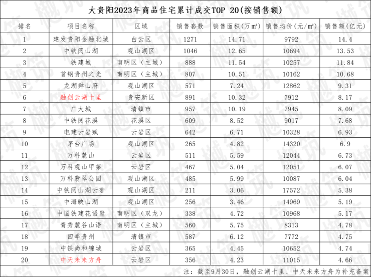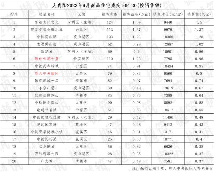 接下来看项目榜单。在9月大贵阳住宅销售榜单中,首钢贵州之光突然发力拿下榜首,不知道是不是老城文旅市场持续向好,文化氛围日益浓厚给项目加了buff,总之项目当前关注度确实很高。