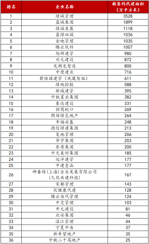 值得关注的是,代建“新星”的崛起更加迅速。在代建新增面积TOP20的企业排名中,除了龙头绿城管理、蓝城集团等,金地管理、腾云筑科,去年新签规模也超1000万平方米,还有旭辉建管、兴元建设、龙湖龙智造等企业,也正往1000万平方米的目标冲刺。而位列TOP10-TOP20的企业,包括碧桂园建管、新城建管、泰达建设、中铁置业集团、幸福安基、德信绿建等。