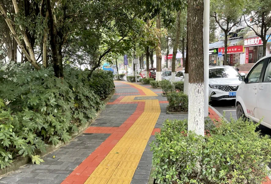 沿着玫瑰路往前,途径万寿竹路,再到人气旺盛的紫荆花路,可看到经整改后,重新调整出了一条平整、无阻碍的盲道,路边文化元素由玫瑰变竹、再变为紫荆花,颇吸引眼球。