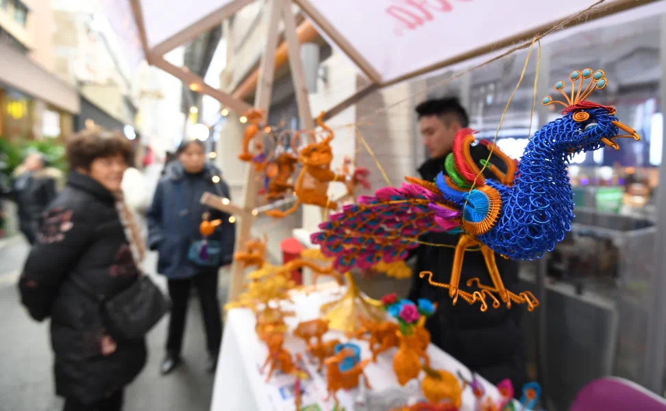 市民游客在一家民间手工艺品摊位观赏手工艺品