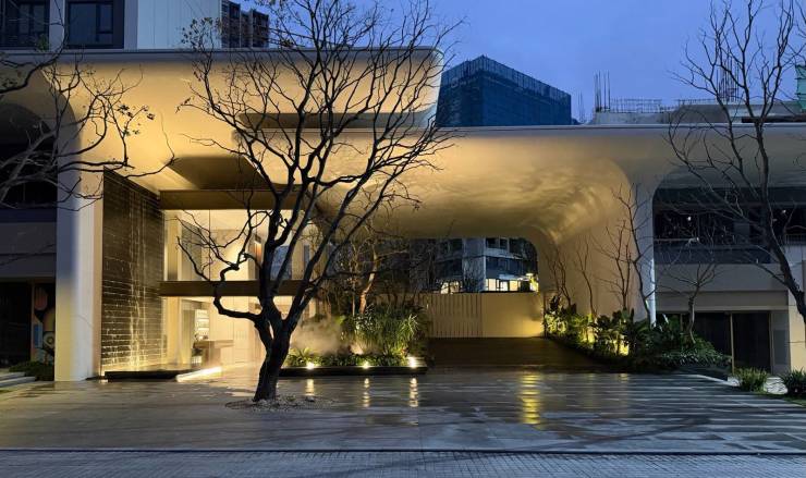 作为社区的 “门面担当”,项目工区大门以星级酒店标准打造,32米宽、10米高的恢弘尺度,搭配对称式设计,一亮相便尽显气派。大门中央设置叠级水景,水流沿石材立面缓缓而下,辅以动态水幕,营造出 “水映门庭” 的仪式感,让每一次归家都如赴一场礼遇。