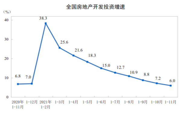 开发投资增速连续9个月收窄国家统计局数据显示,1—11月份,全国房地产开发投资137314亿元,同比增长6.0%;比2019年1—11月份增长13.2%,两年平均增长6.4%。其中,住宅投资103587亿元,增长8.1%。至此,房地产开发投资增速自今年3月起已连续9个月收窄。
