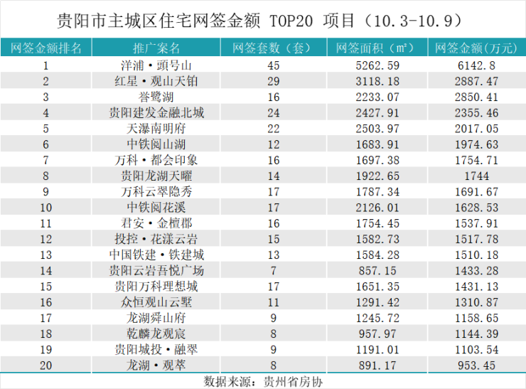 据贵州省房协统计数据,2025年10月3日至2025年10月9日,贵阳主城六区住宅网签金额榜单中: