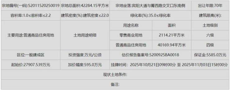 10月9日,据贵阳市公共资源交易中心公告,位于观山湖区宾阳大道与菁西路交叉口东南侧的52011520250019号商住用地,即观山西破损山体北侧地块挂牌入市。